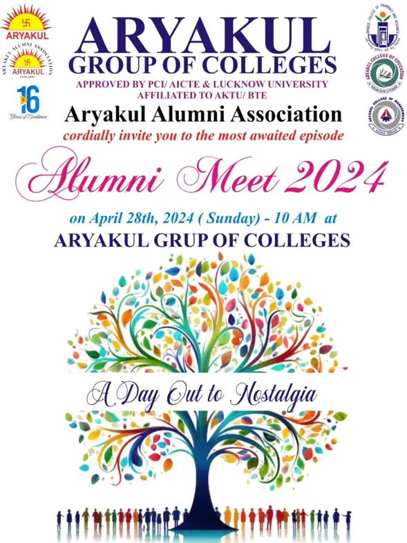 The Aryakul has the honour of 15 passed out batches of B. Pharm and 12 batches of M.Pharm including all three branches Pharmaceutics, Pharmaceutical Chemistry and pharmacology and 06 batches of D.Pharm. An active Alumni Association has been formed to have interaction with the senior passed out and engaged in the job either in Govt Sector or in private sector. The alumni of Aryakul are spread out in a wide range of companies holding the good positions in both the sectors like Govt and private. In the year of 2024, the meet of the Aryakul alumni has been held. In which the alumni of Aryakul came from all over India and presented their best experience to their Junior Aryakulites and committed to provide the best relevant information to the juniors for their benefit.